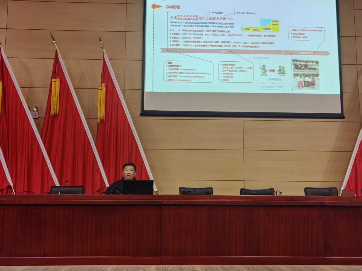 讲座开场,陈宽教授以“办学历程”为线索,追溯我校自1985年以“天津中德现代工业技术培训中心”为起点的发展路径。他详细介绍了学校从开展中德合作职业培训起步,逐步发展成为一所拥有机械、汽车、航空等优势学科的应用技术大学的过程。陈宽教授强调“校史是最好的教科书”,我校三十余年来始终坚守“应用技术型“的办学定位,培养了超过10万名技术技能人才,在中德职业教育合作、产教融合领域树立了典范。