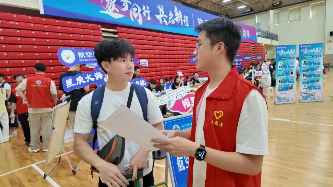 在学校体育馆内,红色看台与蓝紫色横幅交相辉映,志愿者们引导着步入大学校园的新同学及其家人穿梭在人群中。“逐梦同行,共启新程”、“扬帆起航,奔赴万里”……一条条标语传递着学院对新生的美好期盼,一个个立牌体现着航空学院的特色与活力。