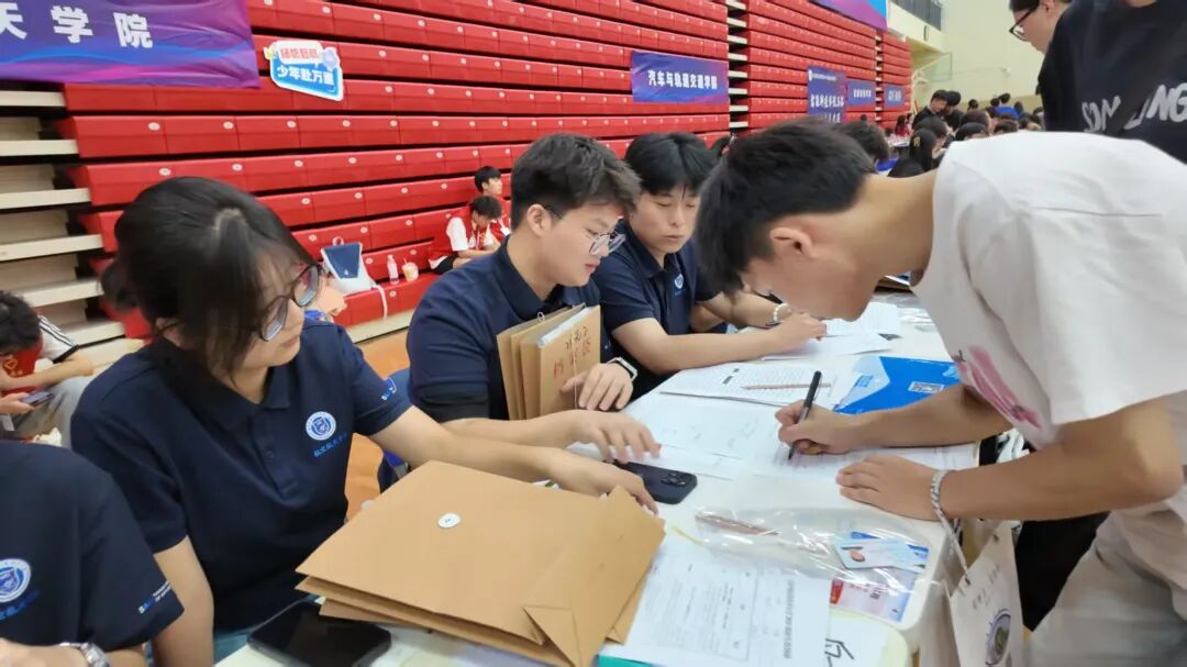 学生班主任耐心指导新生办理入学手续,细致解疑答惑,成为大学校园里第一份贴心陪伴;从行李搬运到宿舍指引,身披红色文化衫的志愿者们是入学路上最安心的路标。