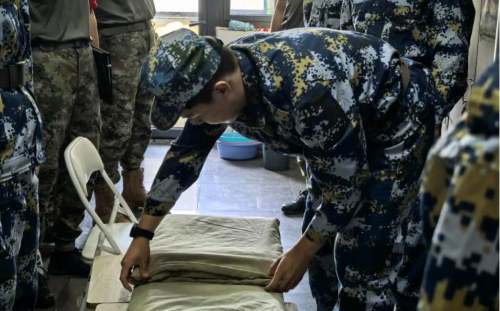 出门看队列,进门看内务。内务整理是军训的必修课,是锻炼自我管理能力、培养严谨细致作风的重要环节。教官们深入宿舍,为同学们现场演示了军被叠放,新生们认真学习。