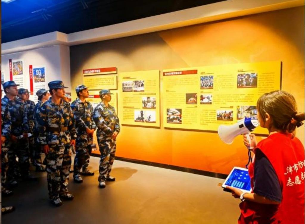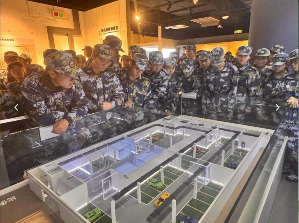 为增强学生的国防意识和人防观念,军训团组织新生分批参观了校人民防空教育基地。在讲解员的引导下,同学们有序步入展厅。