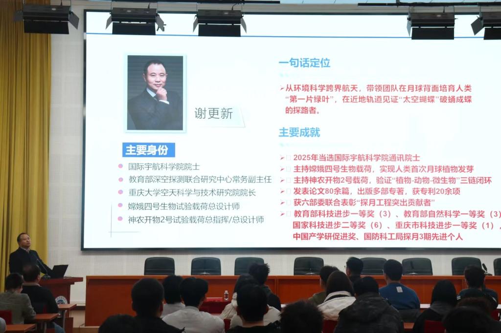 从搭载棉花、油菜、马铃薯、拟南芥、酵母、果蝇的微型生态设计,到“小罐子”里的航天归零标准;从月面嫩芽破土的激动瞬间,到未来月球基地、太空生命科学的前瞻展望,谢教授用平实语言讲透尖端科技,用科研故事传递特别能吃苦、特别能战斗、特别能攻关、特别能奉献的航天精神。